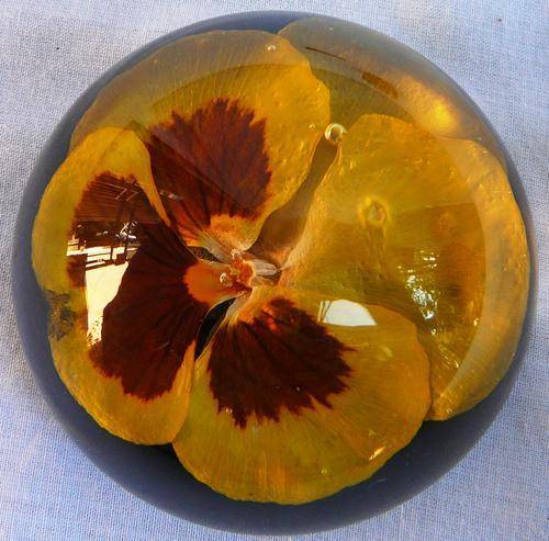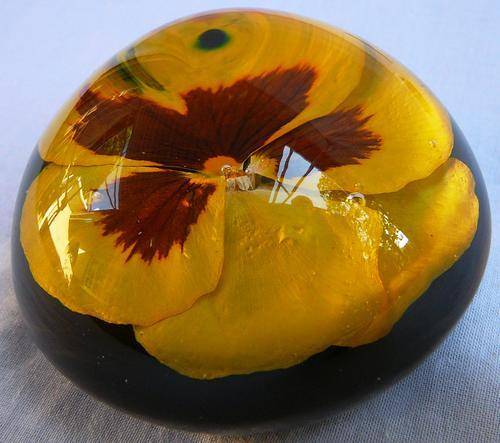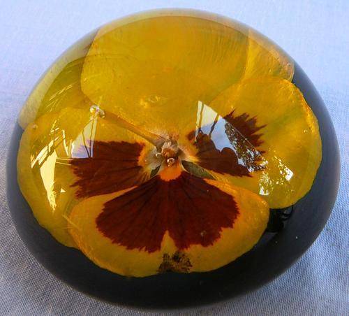 This Paperweight has a real pansy flower inside what I think is clear resin. It is in very good condition. It is 54 mm high has a diameter of 81 mm and weighs 217 grams.