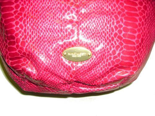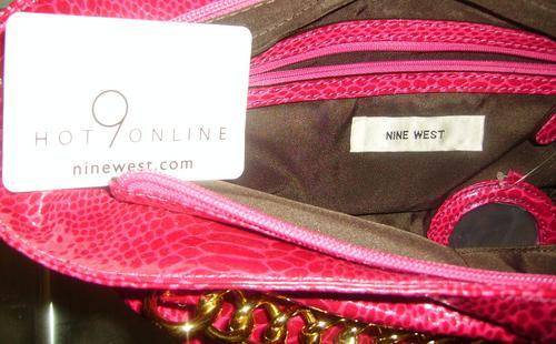 The Nine West - Pouchette Medium Crossbody (Raspberry): Accent your look with gold trend-right metallics carrying this medium-sized crossbody pouch. Man-made material has the look of snake skin. Holds your wallet, sunglasses, personal technology and a bottle of water. Detachable, adjustable crossbody strap. Crossbody drop: 20 length. Top zip closure. Brown fabric lined interior features a back wall zip pocket and multifunctional slip pockets.