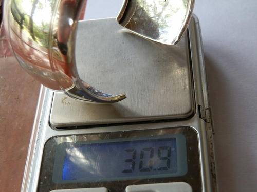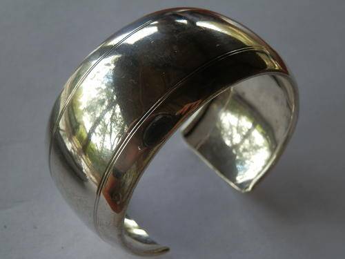Vintage solid 835 silver bangle, circa 1930, marked and in good condition. The inner size of the bangle is 5.4 x 5.6 cm, the width 3.1 cm and the weight 30.9 g.