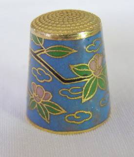 A cloisonne (enamelled metal) thimble with a bird and flowers on a blue ground.
