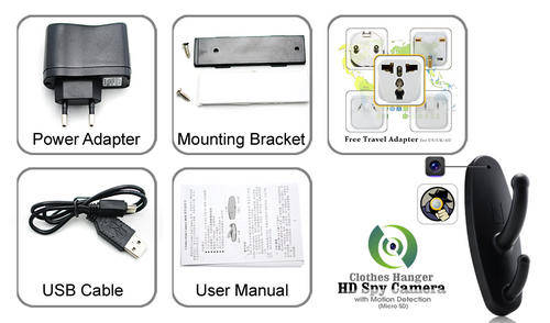Surveillance Spy Clothes HangerUSB CableAC Wall Adapter (100-240v)Basic user Manual - EnglishSticky pad mounting bracket