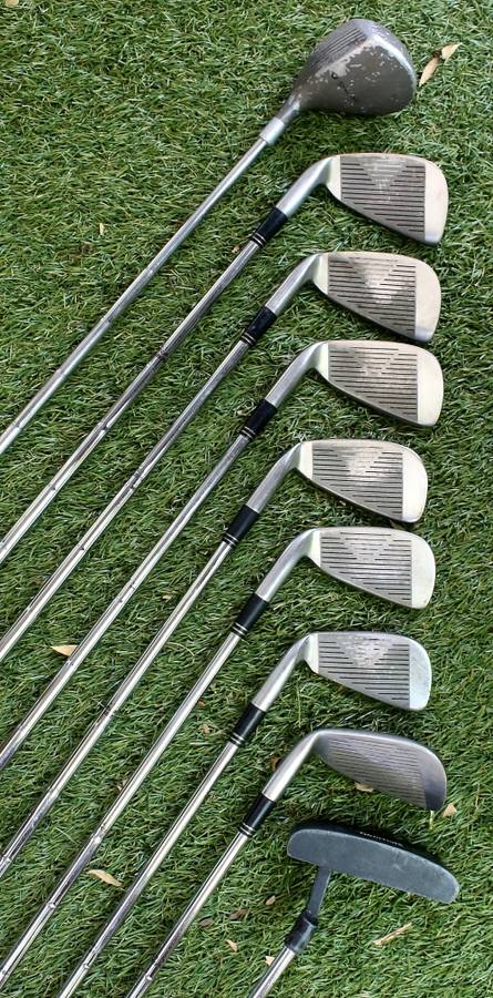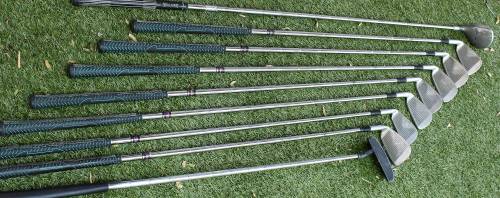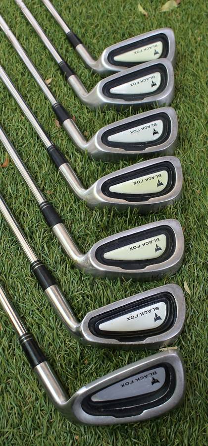 Clubhouse Collection Golf bag in very good condition including rain hood (all intact). Clubs as follows: Black Fox S,4,5,6,7,8 and 9 (all with True Temper Dynamic shafts, Grips are worn a bit on one side as per photos)