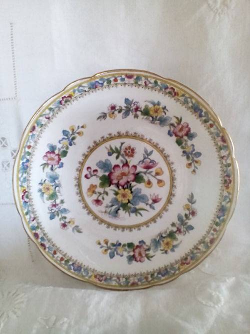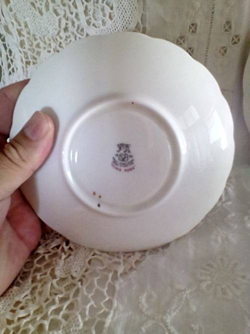 Side plate measures 18 cm across. Saucer measures 15 cm across. Cup stands 8 cm high and measures 9cm across the top.