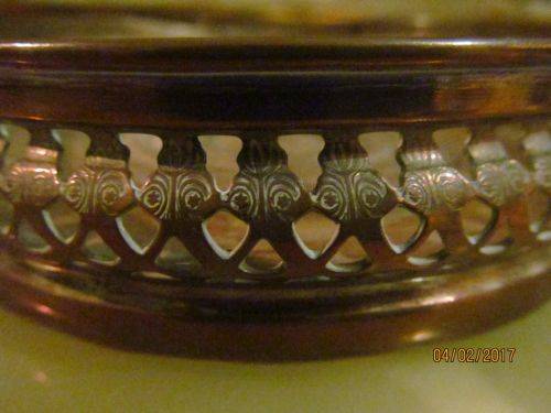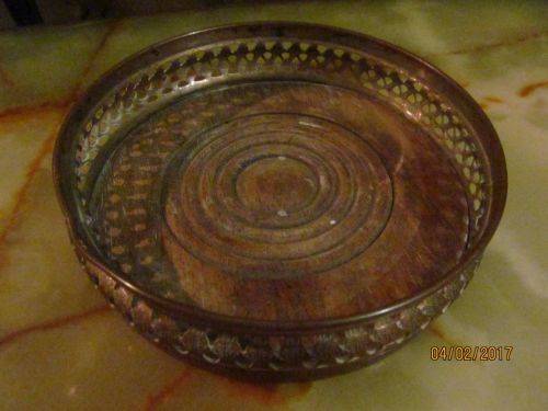 VINTAGE PIERCED METAL COPPER BOTTLE COASTER WITH A WOODEN BASE