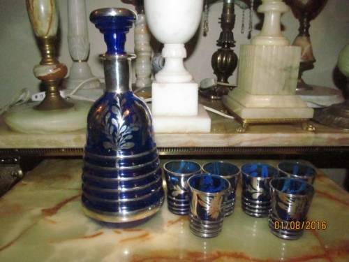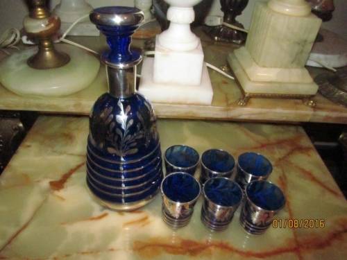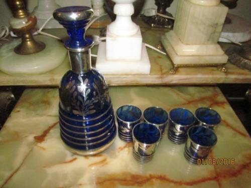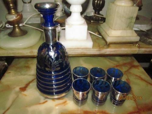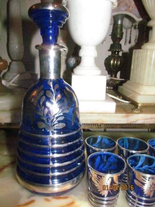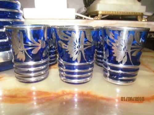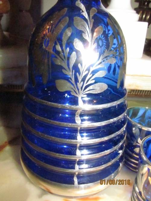 The Silver is 925 quality and decorates the beauty of the Deep Blue Glass in a superb Floral pattern. Each item is also generously decorated in Silver Trim