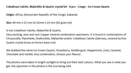 Cobaltoan Calcite, Malachite & Quartz crystal lot - 8 pcs - Congo - Ice Cream QuartzSpecimen Lot