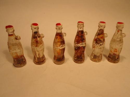 The item on display are a Coca Cola - A veriety of Miniature Coke Bottles in good condition. 1 x 5.8cm Coke Bottle, 6 x 4.5cm Coke Bottles with eye lid to fit onto key ring and 1 x 4cmLead Coke bottle, unfortunately the eye lid to fit on key ring is broken off.