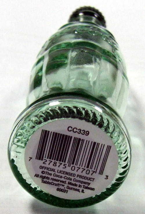 Clear green glass classic mini contour bottle shaped salt & pepper shakers. Each measures 11cm tall. Lids are identical, so you can fill with the spice of your choice. Licensed by Coke. Rubber stoppers fit snugly on the bottom. They look just like old time contour bottles with raised Coca Cola script logo on each. They are not boxed, but will be well wrapped.