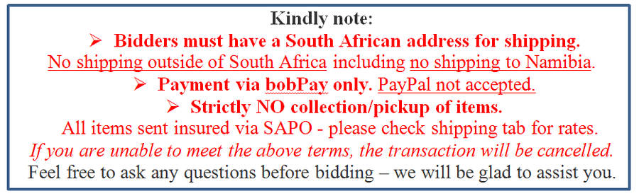 R35.00 Standard shipping using one of our trusted couriers applies to most areas in South Africa. Some areas may attract a R30.00 surcharge. This will be calculated at checkout if applicable. Check my rate