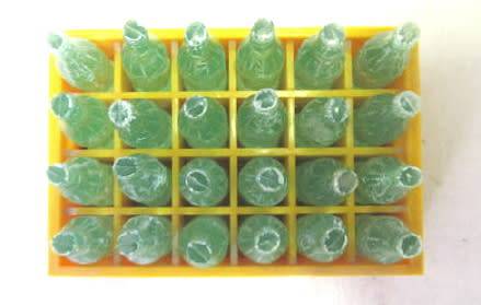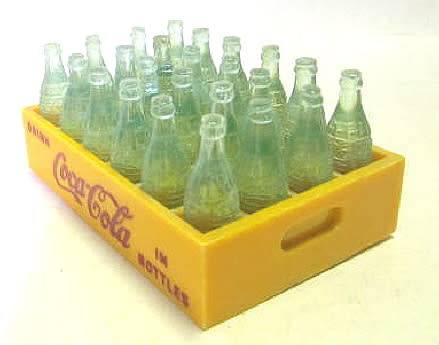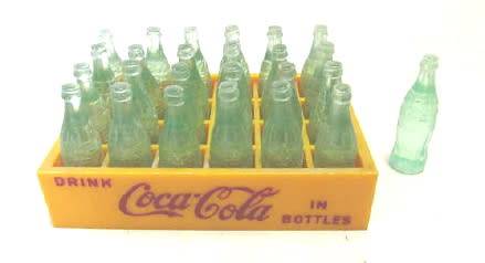 A very collectable vintage Coca Cola item: a miniature plastic crate with all 24 of its plastic bottles. An extra bottle is included. Condition still very good. Size of crate 90 x 60 x 20 mm; height of bottles 40 mm
