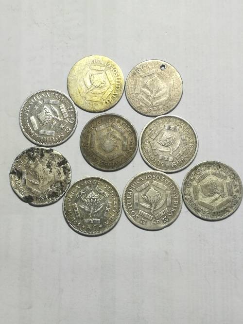 coin lot selection of union of sa sixpence coins and one 1961 5c coin . 9 coins in total