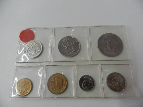 Coins: South African collectable uncirculated Mint set in plastic sealed pouch. A 1983 full set Rand 1, fifty cents, twenty cents, 10 cents, five cents, two cents and one cent. R1 = KM#88a