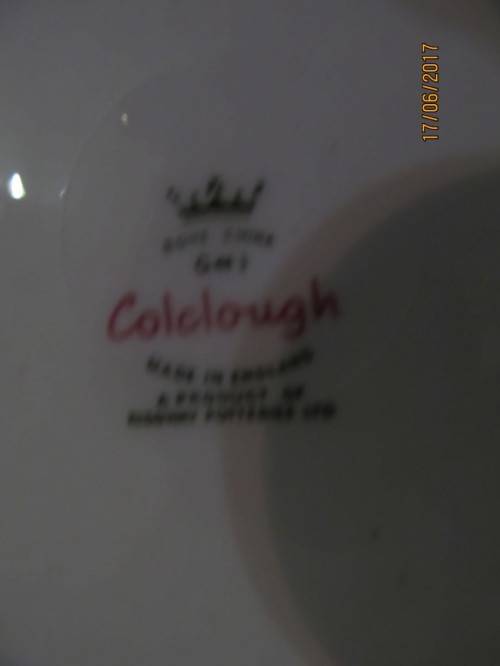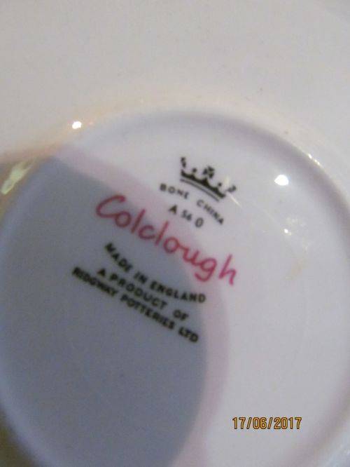 STAMPS/MARKS ETC : ALL SAUCERS AND PLATES ARE MARKED -- "BONE CHINA, E 56 5, COLCLOUGH, MADE IN ENGLAND".....A PRODUCT OF RIDGWAY POTTERIES LTD