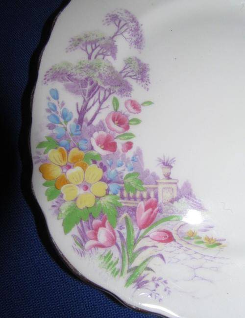 Description: This delightful rare tea plate features a lovely scene of an English country garden in subtle pastel colours with gilded edging and trim.