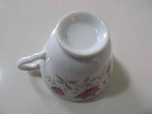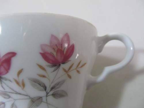 1)- AN UNMARKED TEACUP DECORATED WITH DARK PINK, TAN AND GREY FLORAL PATTERNING. BESIDES FADING OF THE GOLD TRIM ON THE RIM THE TEACUP IS IN PERFECT CONDITION WITH NO CHIPS, CRAZING, CRACKS OR DAMAGES. 7cm HEIGHT.....3.8cm DIAMETER OF BASE.....8.8cm DIAMETER OF RIM