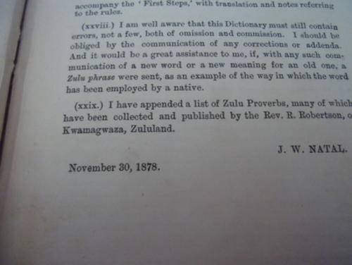 COLENSO'S ZULU - ENGLISH DICTIONARY - J.W. NATAL - NOVEMBER 30, 1878