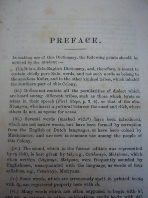 This was the first English - Zulu dictionary published and is a real collectors item. It is in a fair condition, the cover has some damage but all the pages are intact.