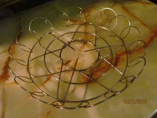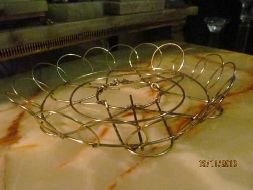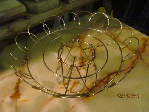 Unique and useful this Lovely Stand is made from Metal strands twisted into a Beautiful Pattern to create the Ideal Pot/Dish stand. This Stand has 6 Looped Rests which are attached to the circular center by means of curved ends. They are placed together in such a manner as to allow them to swing downwards creating a Stand/Foot for the item. The extent to which they are pressed downwards is entirely up to YOU and this also permits a different height each time. When the Rests are folded up they form part of the Pattern of the Stand.