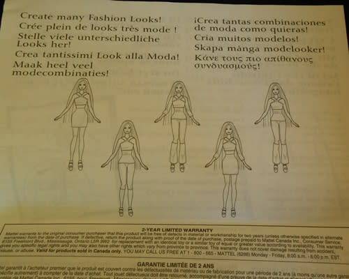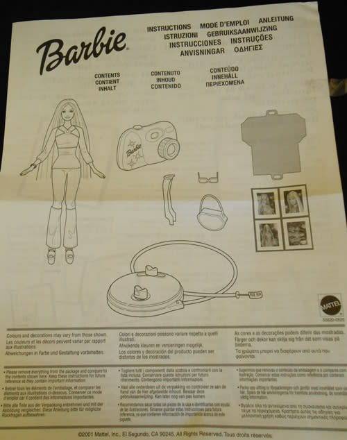 Kayla has dark brown hair with brown eyes and a slighly darker skin tone.She is dressed in clothes that can be changed in different styles. The fake camera is connected to a stand and if the camera lens is turned, the doll changes her pose. The copyright is Mattel 2001 and the fashion is a reference for that time. The doll has not been removed from the box. the box is slightly damaged(Shop soiled).