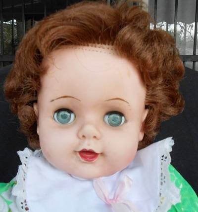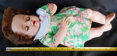 This beautiful big doll is marked J on the back of her head and F20-5 on her lower back. She is made of hard vinyl and is unusual as she is jointed at her knees and elbows as well as the head and shoulders and hips. the head is made of softer vinyl and she has rooted auburn brown hair. there is some hair missing in the first row and also a bit of thinning in the back. this is not very visible and she is still in a very good shape for a doll that is 50 or more years old.Her eyes may be slightly faded, lashes are good. two small black spots on her right arm.