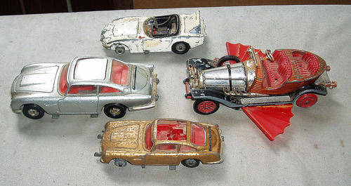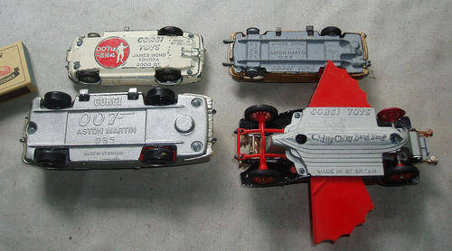 ITEM DESCRIPTION.........OFFERED FOR AUCTION....4 VINTAGE CORGI TOY VEHICLES IN PLAYED WITH CONDITION. AN INTERESTING LOT FOR SPARES OR RESTORATION. COMPRISING KING SIZE CORGI 007 METALIC SILVER JAMES BOND ASTON MARTIN....THIS IS THE MOST COMPLETE CAR IN THE BEST CONDITION OF THE FOUR.....ORIGINAL PAINT, TYRES AND ACCESSORIES....A COUPLE OF MINOR DEFECTS, GUNS IN FRONT STUCK, PASSENGER FIGURE AND SEAT MISSING FROM PUSH UP ACTION, KIDS ALWAYS LOOSE THIS PIECE.....NO MAJOR DAMAGES TO THIS CAR, NO BROKEN WINDOWS. THERE ARE TWO OTHER JAMES BOND CARS, A SMALLER CORGI ASTON MARTIN IN METALIC GOLD AND A LATER TOYOTA 2000GT, BOTH OF THESE ARE IN VARIOUS FORMS OF DISTRESS, BUT COMPLETE BODIES, PERFECT FOR RESTORATION. LASTLY IS A RARE CORGI CHITTY CHITTY BANG BANG CAR IN DISTRESSED PLAYED WITH CONDITION, BUT STILL INTACT, SOME MINOR DAMAGES....ALL STANDARD CORGI SIZES (SEE MATCHBOX FOR COMPARISON). THERE ARE A FEW PLASTIC TYRES MISSING, PAINT SCUFFS AND A FEW OTHER MINOR ISSUES...SOLD AS IS.