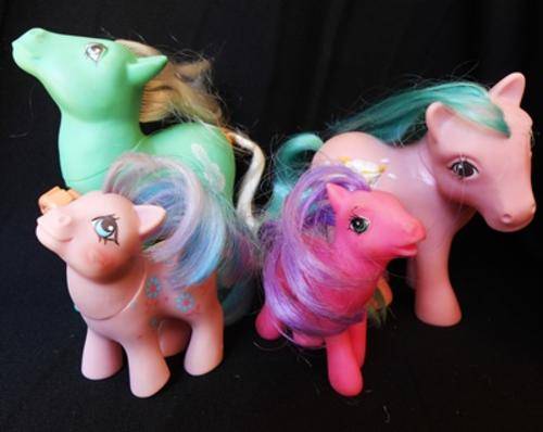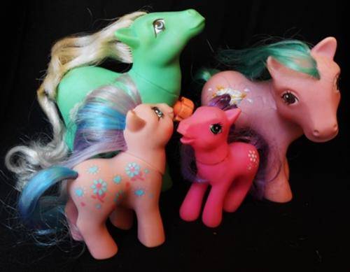 The 13 cm Green Pony has a button in front which twirls the tail around and a violin picture.the 12 cm pink pony has a cupcake or icecream Please look at the photo's
