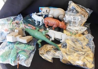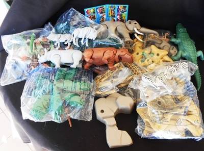 This Playmobil set is still in the original plastic packaging and has not been played with or assembled . It could be more than one set but there are no boxes as it was bought in England. There are a big and small elephant, two zebras, a family of five lions, two wildebeest,two giraffes,a rhinocerus, hippopotamus, crocodile, 3 vultures and skeletons,monkeys.there are two sets of trees and other scenery to build. also a set of two camels and desert pieces which was probably a separate packet.