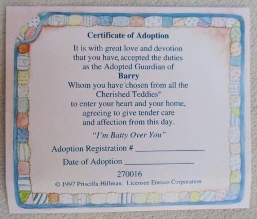 BARRY IS A 1997 PRISCILLA HILLMAN FROM ENESCO TEDDY BEAR - 9CM TALL AND HE SAYS 'I,M BATTY OVER YOU' BOTH BEAR, PAPERS AND BOX IN GREAT CONDITION - CUTE AND COLLECTABLE REFER IMAGES