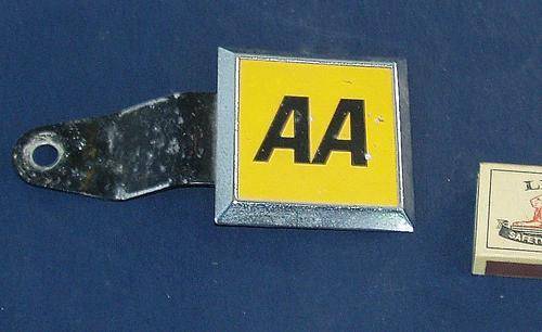 HANDY, SELDOM SEEN SQUARE SHAPED AA BADGE, COMPLETE WITH METAL ATTACHMENT TO FIT ANY VEHICLE TO SUPPLEMENT THE OTHER FULL WINGED BADGE OFTEN SEEN. USED CONDITION, SOME TARNISH ON THE SILVER PLATED RIM AND A COUPLE OF PAINT FLECKS ON THE YELLOW AND BLACK, BUT GENERALLY IN EXCELLENT CONDITION. MEASURES APPROX 15CM LONG WITH METAL ATTACHMENT AND BADGE ABOUT 7,5CM SQUARE.