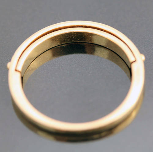 This piece was found at a favourite vintage jeweller in London; English jewellers went through a phase of secret love messages in their jewellery, and this piece is a lovely example of this. The vintage ring is crafted in 9ct yellow gold, and features a hinged drop down yellow gold second "shank" inside the outer shank, with the words "I love you" and a small heart engraved thereon. The shank is 3mm wide on the front of the ring, narrowing slightly to 2mm at the back of the shank. The double layer of gold in the front half of the ring measures 2mm in thickness. The ring head section features a row of round cut diamonds claw set in 9ct white gold, and then dropped into the 9ct yellow gold to create lovely contrast. It is quite solid - 2,97 grams - and the pedigree of the piece is evident in it's many hallmarks: the Sheffield Assay Mark, the jeweller's signature, DIA indicating authenticated diamonds and .10 for the diamond carats. Quite a special piece, and very collectable!