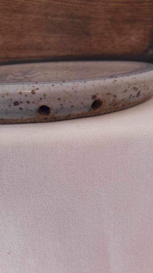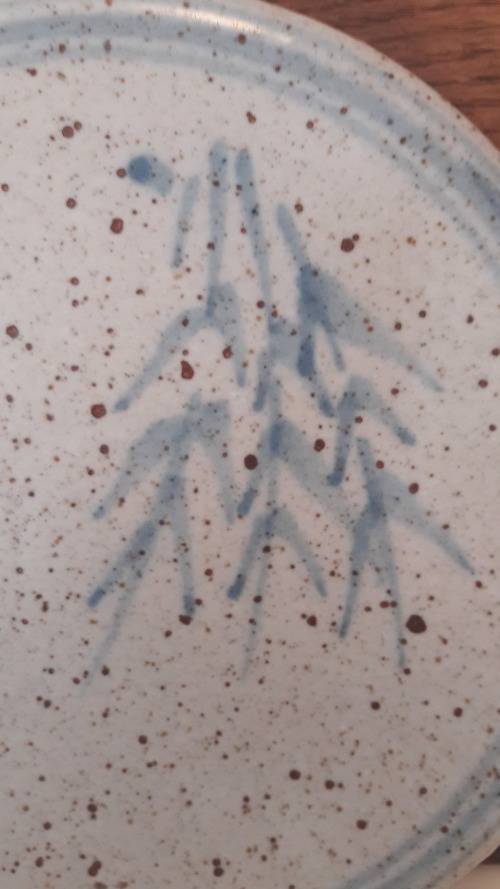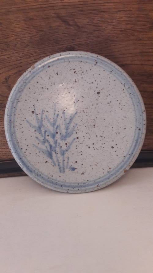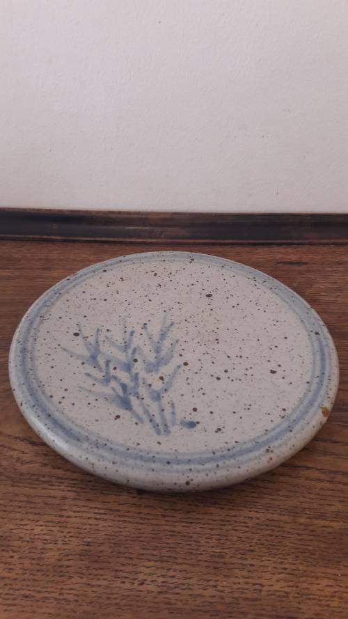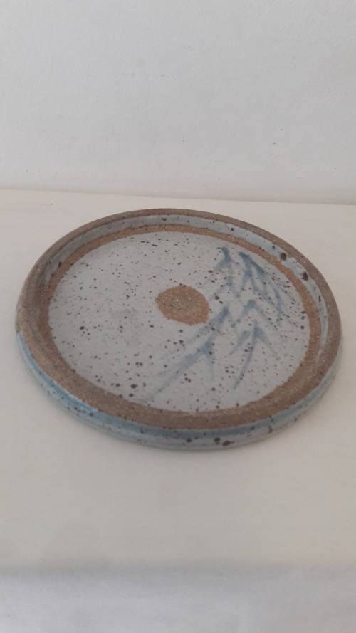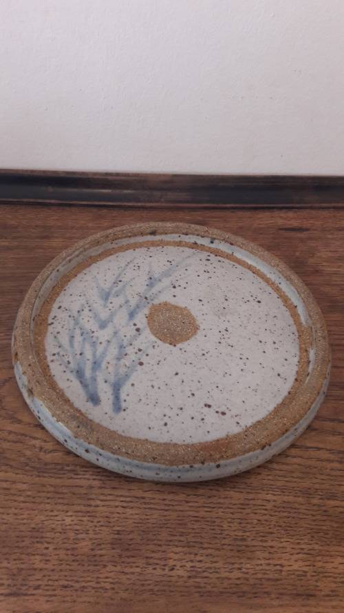 Offered for sale is a highly collectible stoneware platter by South African master potter the late Hyme Rabinowitz (1920-1990), a highly rated and renowned pioneer studio potter from the Cape. Rabinowitz was born in Namaqualand in 1920 ; he worked with Esias Bosch at White River in the early 1960's and also received mentorship from the famous British studio potter Michael Cardew at Wenfordbridge Cornwall in 1966/67. From the late 1960's he was based in the Cape working from a farm called Eagles Nest in Constantia . This item is a medium sized stoneware platter possibly intended as a cheese board or trivet but also of course highly decorative as a wall hanging if not in use ; the broad rim of the platter has two small circular piercings indicating the platter was intended to be suspended via a rope or wire strap. The platter is glazed in a thick off white/ buff colour and decorated with a sprig of grass or wheat loosely painted in a pale sky blue glaze ; the motif is repeated on the rear of the platter. The platter has a pale blue border accentuating the round form and off-setting the hand painted motif of grasses. The base has an imprinted mark / stamp with the artists initials HR contained in a circle. This item probably dates to the 1970's or 80's. Hyme Rabinowitz was awarded an honorary MA Fine Arts from UCT in 1992 and numerous other awards for career excellence as a ceramicist and potter including the accreditation of Master Potter from the SA Association of Potters/Cultural History Museum 2002.