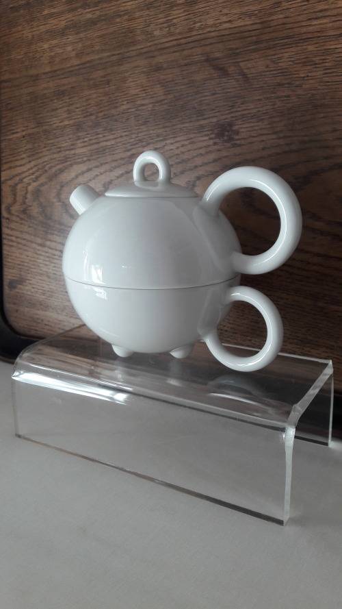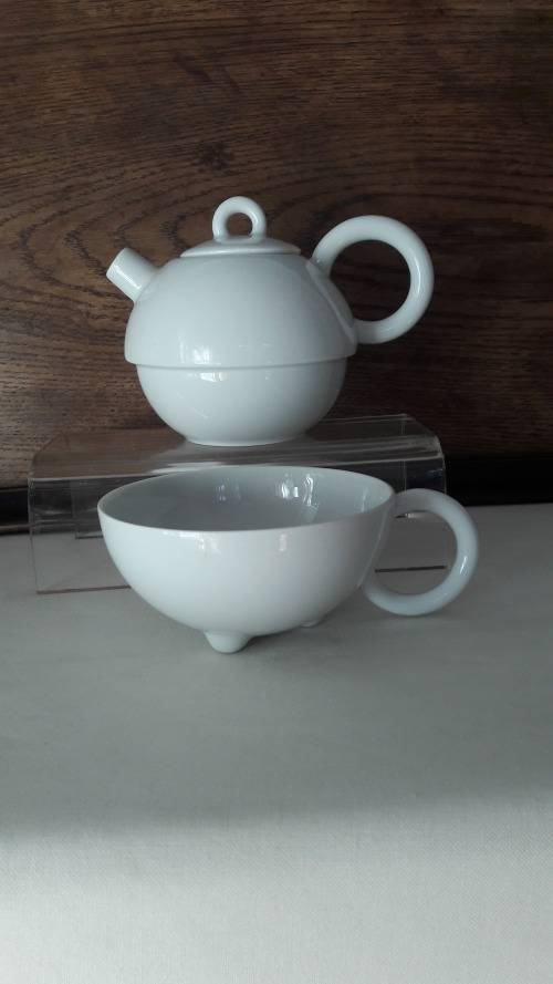 Offered for sale is a collectible hard to find small 'Tea for one" teapot with an integrated large cup forming the base and support for the teapot. The design is by acclaimed designer Matteo Thun for his Fantasia range commissioned by Arzberg in the 1980's circa 1986/87. Matteo Thun is a noted designer from the Memphis school of artists who produced quirky highly individual modernist designs with eccentric playful stylings and detail. This set is in blanc de chine pure white porcelain with a semi gloss glaze. The teapot, cup and lid have hooped ring handles while the spout of the teapot is truncated short and cylindrical resembling a gun turret. The teacup is supported by three rounded stub like feet/supports. Both the teapot and the cup are marked with the Arzberg Germany stamp in green. Postage is R100 via Postnet or R140 for courier delivery to major cities in SA. Collection is welcome from Emmerantia Jhb.