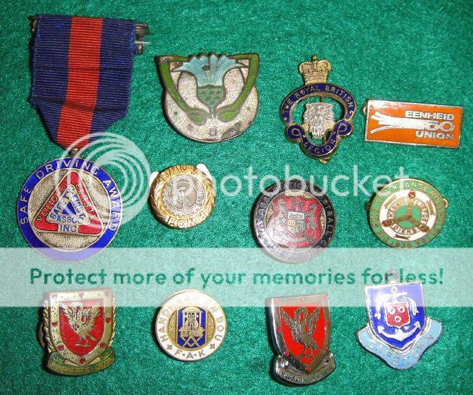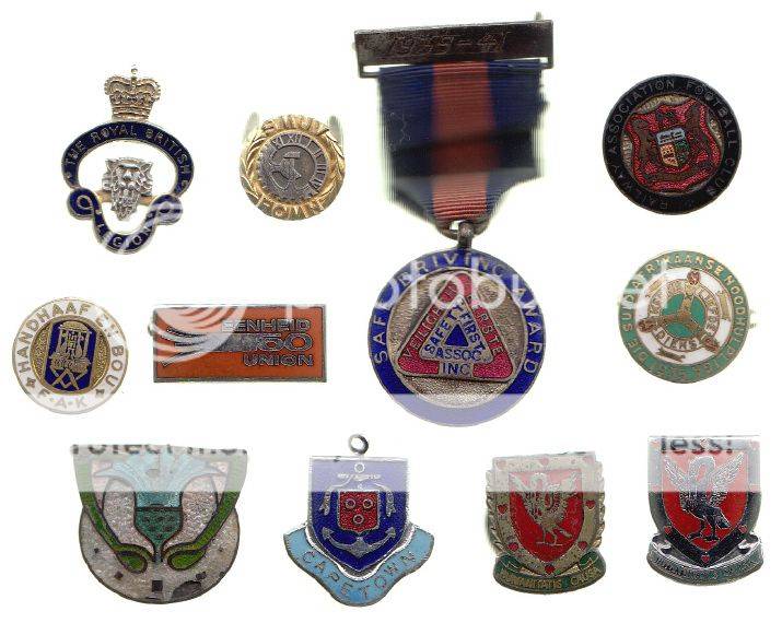 The oldest are the Railway Association Football Club (old South African Coat of Arms), the 1935 SA First Aid League badge, and the 1939-41 Safe Driving Medal.