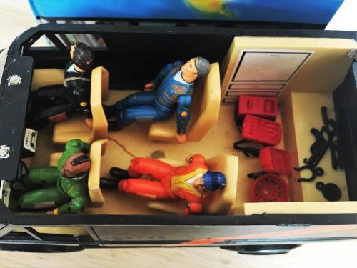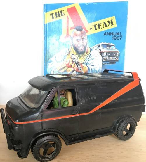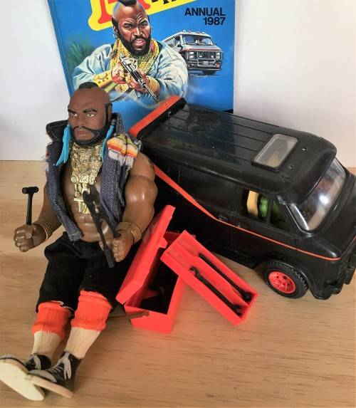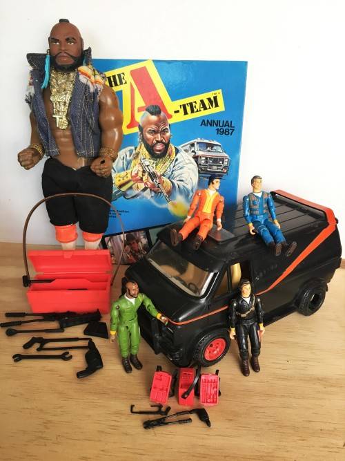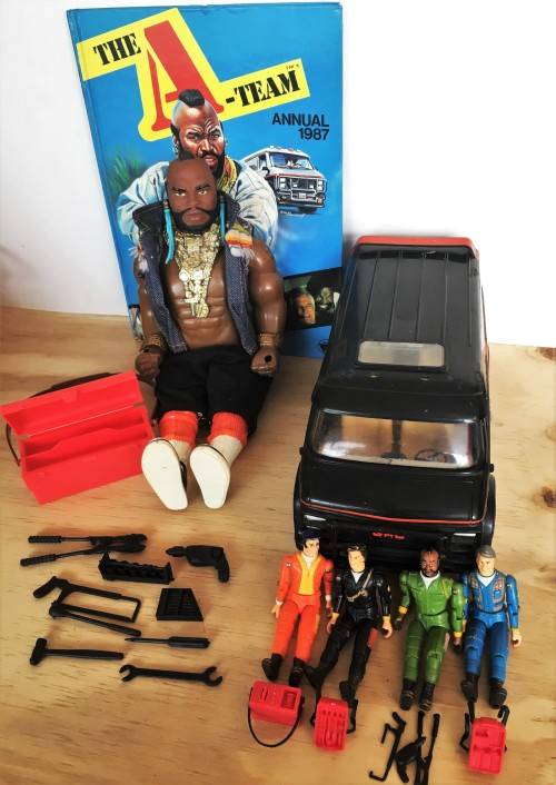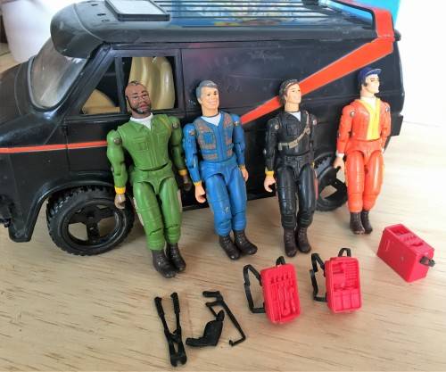 1983 A TEAM VAN WITH ALL 4 ACTION FIGURES: B.A. BARACUS, HANNIBAL, FACE AND MURDOCK (FIGURES APPROXIMATELY 9.5cm TALL) ACCESSORIES INCLUDE 2x BACKPACKS, 1x DETONATOR, 3x LOOSE TOOLS