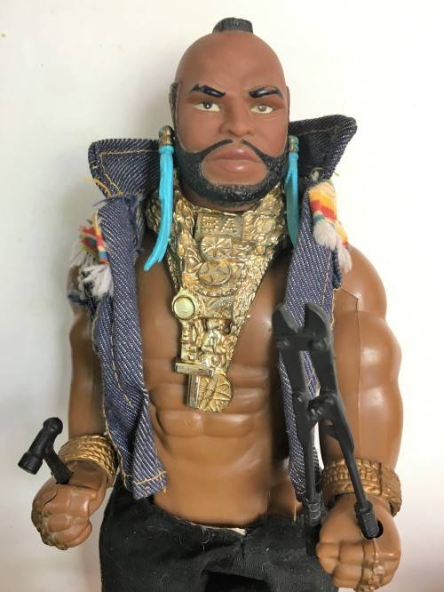 1983 MR T ACTION FIGURE – APPROXIMATELY 30.5cm TALL WITH FABRIC CLOTHING (THE ELASTIC ON THE PANTS HAS LOST ITS ELASTICITY), AND TOOL BOX WITH 9 DIFFERENT TOOLS