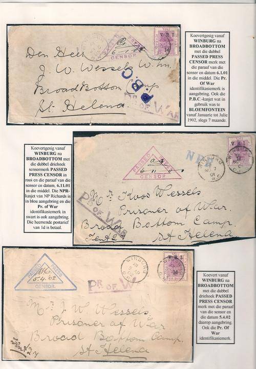 A collection of 3 ANGLO BOER WAR fronts of covers send from WINBURG to BROADBOTTOM CAMP on ST HELENA written up on 1 page in Afrikaans. On the fronts can the double triangle censor cachets be seen in purple, red and blue with the initials and dates of the censor in the middle. Also the P.B.C. cachet on the 1st front, the identification amrk Pr. of War on all three and the N.P.R. (NP Richards) cachet on the 2nd front.