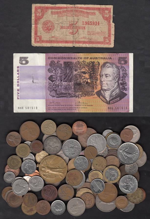 There are over 80 coins in the collection including a medal disk of the First World War Victory Medal. The banknotes are from the Philippines and Australia.