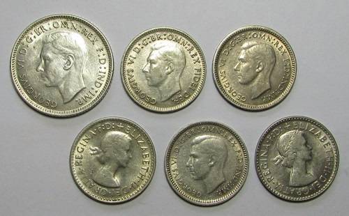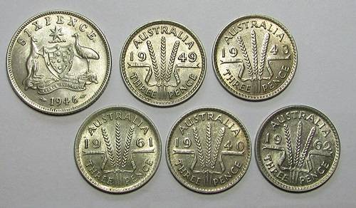 1946 Sixpence , 1949 Threepence, 1943 Threepence, 1961 Threepence, 1940 Threepence,1962 Threepence