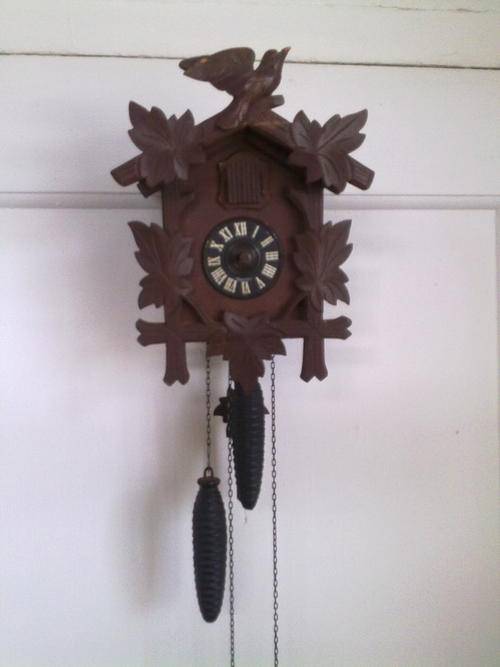 This cuckoo clock is working but needs hands. The face needs to be attatched. complete with weights and pendulum.