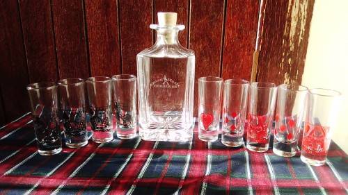 PLEASE REFER TO THE PHOTOGRAPHS AS THEY DO FORM PART OF THE DESCRIPTION. 9 X CARD DOUBLE TOT SHOT GLASSES 10.5CM IN HEIGHT AND 4 CM ROUND TOP OF THE GLASSE WIDTH