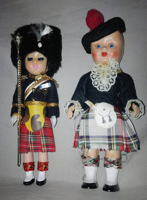 DESCRIPTION: THESE TWO SOTTISH DOLLS ARE COLLECTOR'S ITEMS AND STAND 16cm HIGH - BOTH IN GOOD CONDITION.