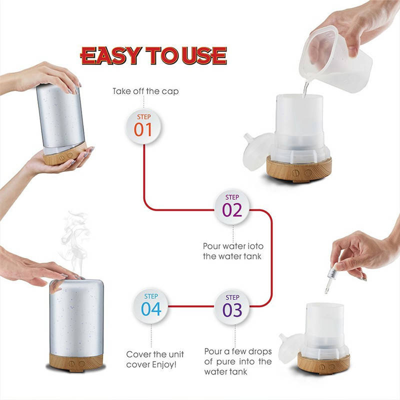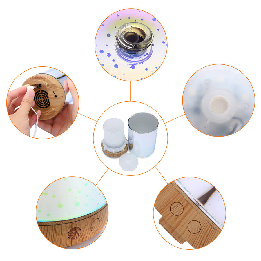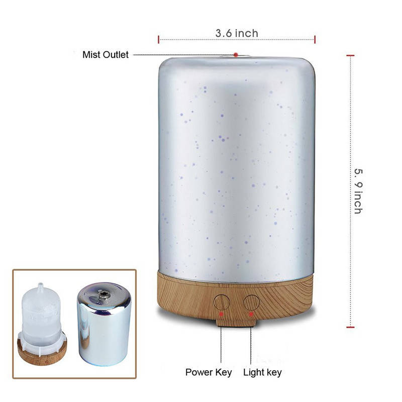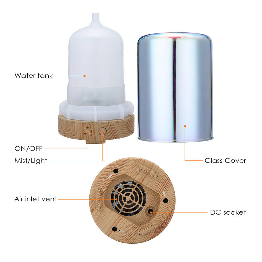Material: Glass cover, and PP Tank Capacity: 100ML Operating time: Spray volume 4 hours ± 1 hour Input Voltage: 100-240V Output Voltage: DC 24V Power: 12W Ultrasonic Frequency: 2.4MHz LED Number: Six full-color LED lights gradient colors Package Included: