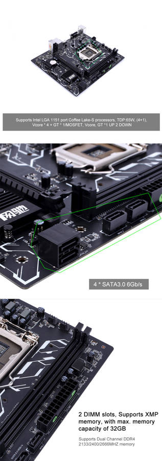 Features: 1. Supports 8th and 9th GEN Intel Core Processors (Socket 1151) 2. Supports Dual Channel DDR4 2133/2400/2666MHZ memory 3. 4*SATA3.0 ports 4. RTL8111F 1000M LAN 5. Realtek ALC662 6-ch audio chipset 6. VGA+HDMI ports 7. 6*USB2.0 and 4*USB3.0 ports(include headers) 8. Audio isolated LED light 9. Support S3、S4、S5 wake-up 10. Support phone call startup、timing boot、network S5 wake-up Package Included: 1* Drive CD 1* Motherboard installation manual