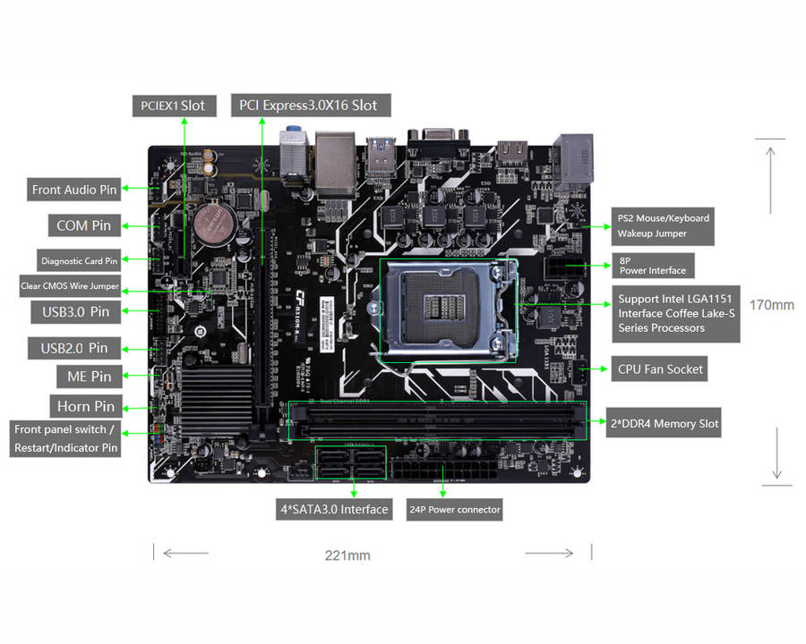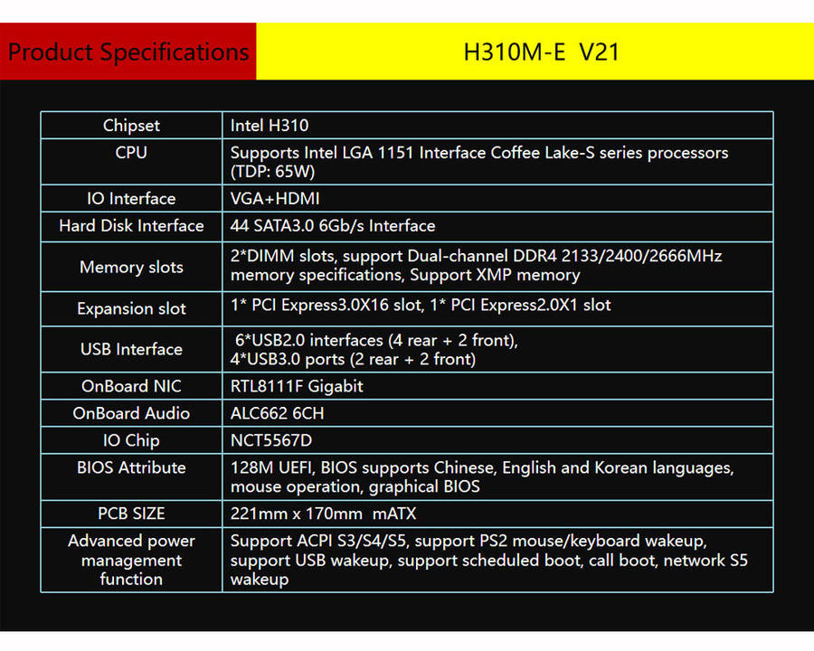| Product | Colorful H310M-E V21 Intel H310 Chip M-ATX Motherboard Mainboard Support Intel LGA1151 Interface Coffee Lake-S Series Processors |