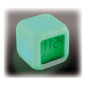 The product features colour changing feature and has functions for display for 12/24 hour time, date, day and temperature (f or c), alarm with 8 different sounds