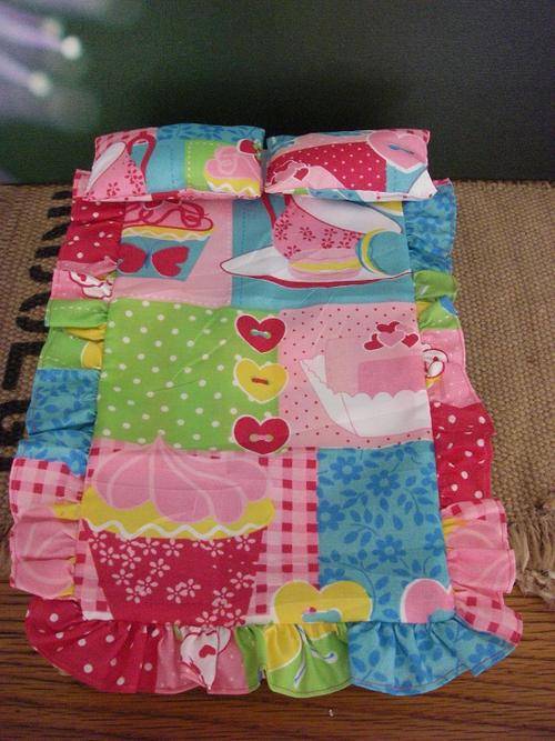 Colourful bedspread cover, 2 x pillows for Barbie or Steffi doll. Fits miniture single or double bed