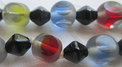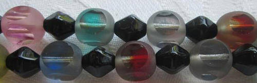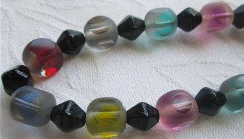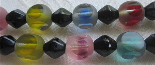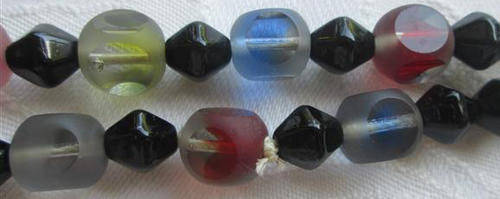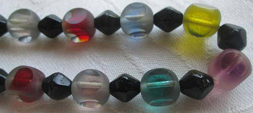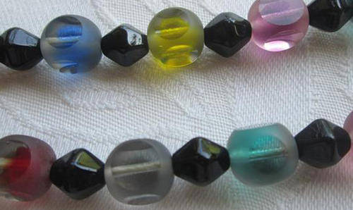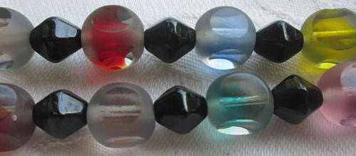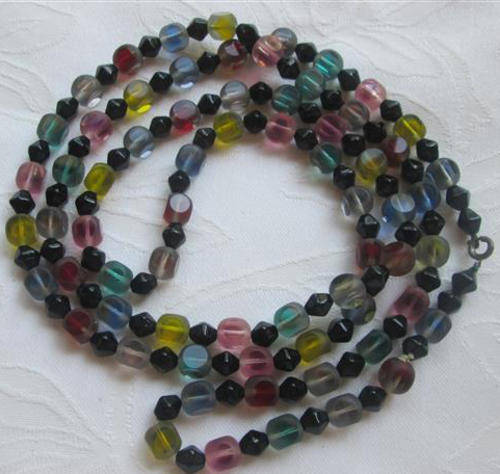 TASTFULLY COLOURFUL !!! VINTAGE COLOURED GLASS BEADS WITH A FROSTED COVERING THAT HAS BEEN "SLICED" ON FOUR SIDES OF EACH BEAD TO REVEAL THE INNER COLOURS, VERY ATTRACTIVE ......DUE TO THE LENGTH YOU MAY WEAR THIS AS AN EXTRA LONG OR DOUBLE NECKLACE. THE OVERALL CONDITION IS GOOD WITH A FEW TINY NIBBLES TO THE GLASS THAT REALLY CANNOT BE SEEN. LENGTH 120cm. P.S. THE BEADS HAVE BEEN STRUNG WITH SILK CORD, NOT NYLON.
