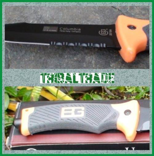 COLUMBIA BG TACTICAL SURVIVAL KNIFE. ^ Half-serrated Stainless Steel Clip-point Fixed Blade. Black oxide surface blade. ^ Ergonomic Textured Rubber grip - Maximizes comfort and ensures non-slip action. ^ Top Quality Saber craftmanship by USA Columbia. ^ Size of Blade: 150mm. Size of Handle: 140mm. ^ Nylon Sheath included. |