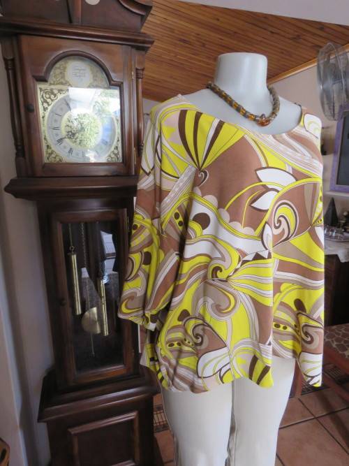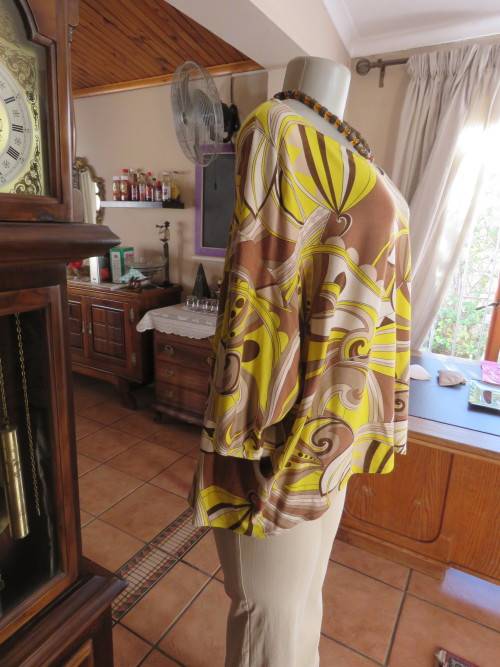 Comfy short top in yellow,white and beige graphic pattern.Size 46-48.Good cond.
