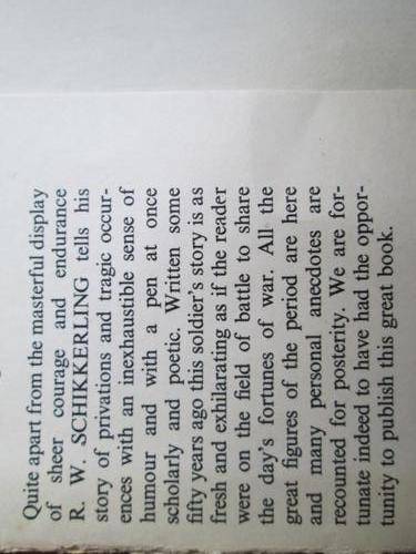 "It is not often that a publisher comes across a manuscript of this kind. A war diary can often be a dull uninspiring record of events, some of which have already been told and often of many others which tend to become monotonous in the extreme. Commando Courageous is, we believe, a book far and away above all personal records of the Boer War that have gone before. The reader will quickly become aware of the tremendous courage of the author which at times borders on the fantastic and he and his fellow Commandos display repeatedly the inborn strength of purpose which can only come from people utterly convinced of the rightful purpose of their own particular passage of arms. Quite apart from the masterful display of sheer courage and endurance Schikkerling tells his story of privations and tragic occurrences with an inexhaustible sense of humour and with a pen at once scholarly and poetic."